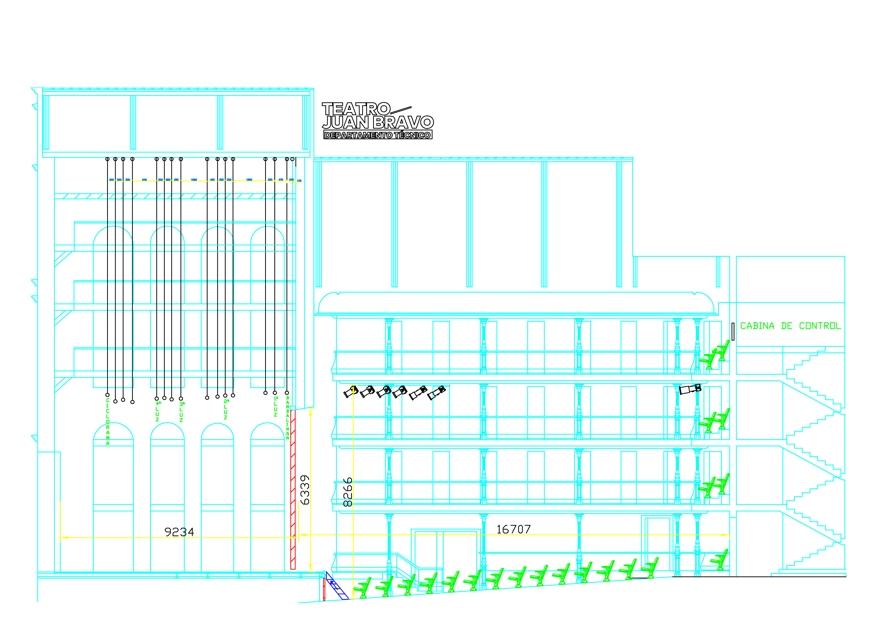 - Seguimiento del espectáculo por T.V. en escenario, hall (entrada de público), cabina de control y camerinos.