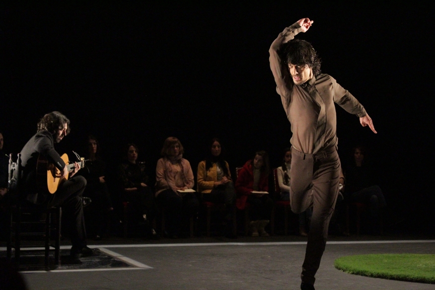 De repente, el Teatro Juan Bravo se convirtió en un tablao flamenco en el que Carmona empeñó pasos, puntillas descalzas, jaleos de brazos o silencios para encontrar el amor del público por el flamenco en el pliegue de una chaqueta o en el frío de unas piernas cruzadas. Invitó a diez espectadores elegidos al azar a acompañarlos sobre el escenario y dio comienzo a un cortejo en el que hasta la arena y las piedras hacían música para que Carmona bailase.